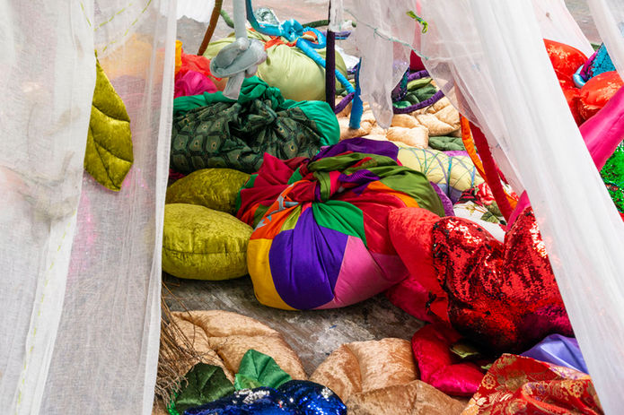 An expanded exploration of the oversized soft-sculpture installations Janno produced during her Masters' studies at VCA (2017-18), Making Nonsense is her response to the pandemic of 2020 with all its accompanying crises, upheaval, and disorientation. Understandable as a defiant celebration of life, resilience, humour, and absurdity, Janno’s enduring preoccupations as an artist encompass ideas about compassion, love, and community as the sustaining principles of a kinder world.