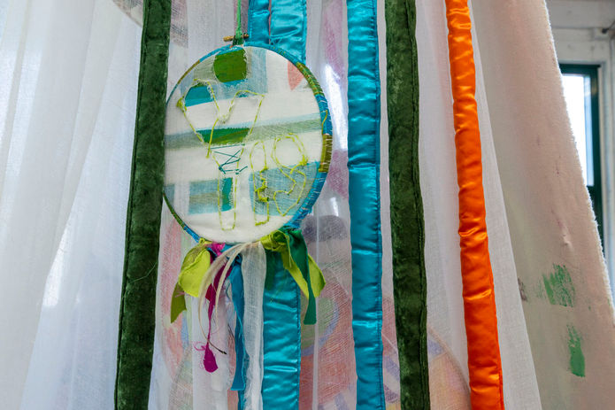 The thought processes and ideas that thread my works and installations appear intentionally at surface light, quirky, zany and ludicrous but contrast with roots profoundly deep, considered, poignant, heartfelt, and at times extremely painful. Ideas explode in colour and thread and multiply leading to other people, other lives, loves and stories. This exhibition is a culmination of just that and the linking thread is love.